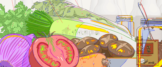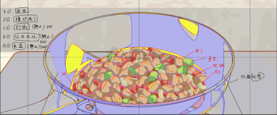 原画人员取得构图设计稿后,在3D模型的基础上进行灶台的作画,这个阶段主要是对鸳鸯灶进行素材分层设计、追加细节、对光影方面做分色作业,并对华帝鸳鸯灶独特的双色火焰以及美味的料理进行作画。