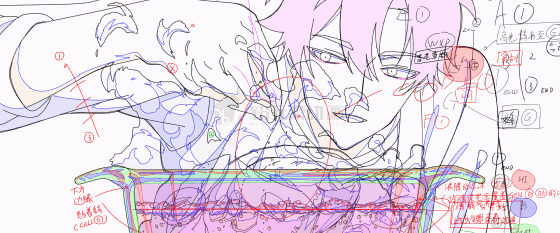 同时,动画部门对鸳鸯灶的原画进行清稿、中割作业。完成后再转到上色部门将鸳鸯灶动画素材的基本、高光、阴影等部位进行填色作业。这一步是为了获得具有高作画对比度且易于由进行后期处理的动画素材。