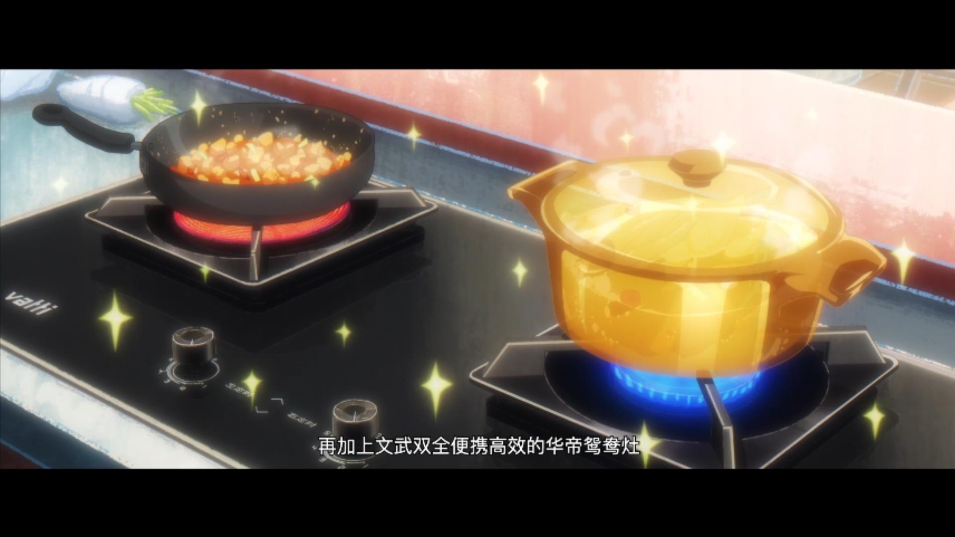当鸳鸯灶的美术素材和动画素材都完成后,一并提交至摄影部门,摄影人员会将动画素材进行提色蒙版作业,再将美术材质素材以恰当的比例与动画素材进行叠加,这样就获得了既有高度作画辨识性,同时具有美术细节质感的华帝鸳鸯灶的成品影像。