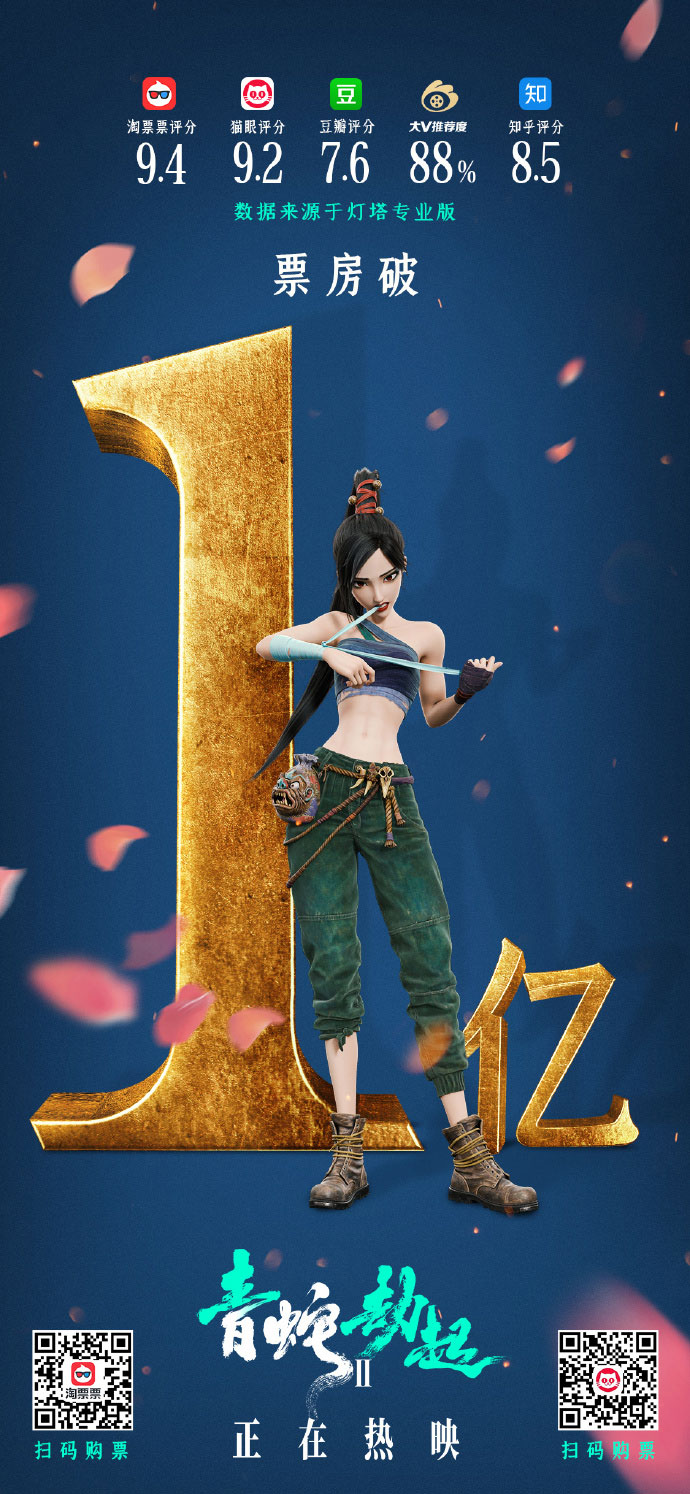 国产动画电影《白蛇2:青蛇劫起》上映两天票房正式过亿,截止目前(7月25日18点)猫眼票房显示即时票房1.8亿。